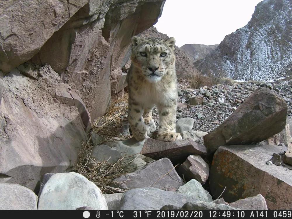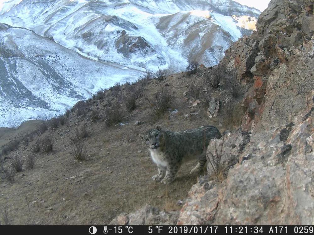 ↑2019年2月20日,在祁連山國家公園青海片區(qū),紅外相機拍攝到的雪豹照片。