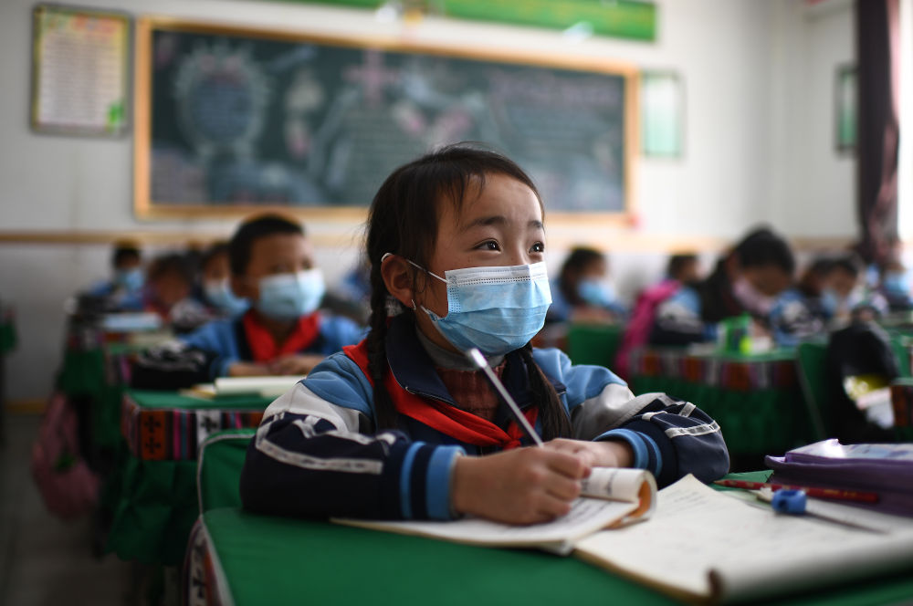 ↑ 玉樹市第三完全小學(xué)二年級(jí)一班學(xué)生求永藏嘎在上課(2020年4月9日攝)。