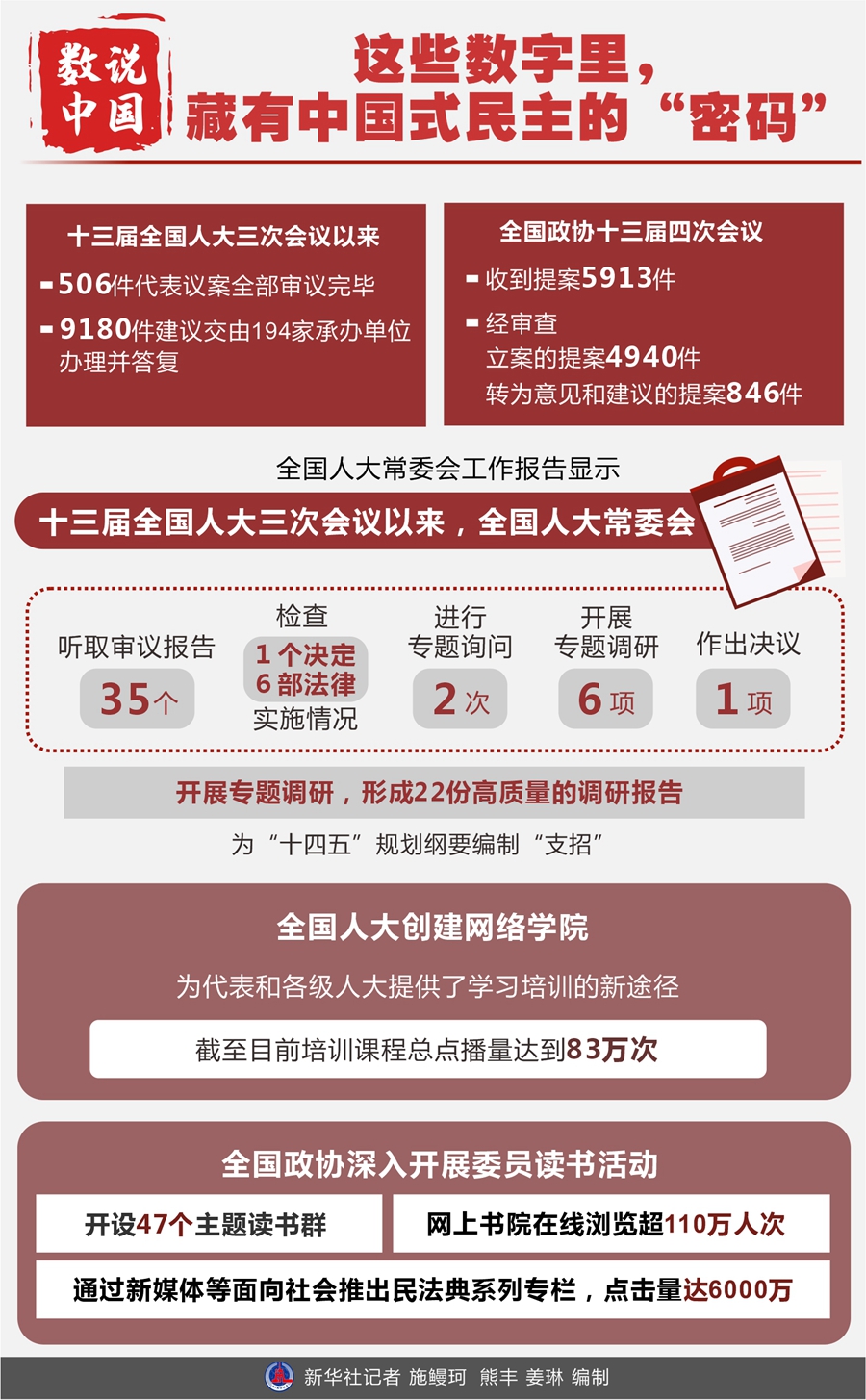 數(shù)字,蘊(yùn)藏中國式民主的“密碼”。透過全國人大常委會(huì)工作報(bào)告、全國政協(xié)常委會(huì)工作報(bào)告和提案工作情況報(bào)告,讓我們從幾組關(guān)鍵數(shù)據(jù)進(jìn)行“解碼”。