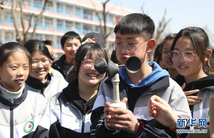 3月22日,山東省臨沂市沂南縣孫祖鎮(zhèn)中學一名學生在做風速實驗。新華社發(fā)(杜昱葆 攝)