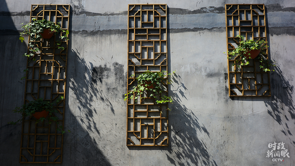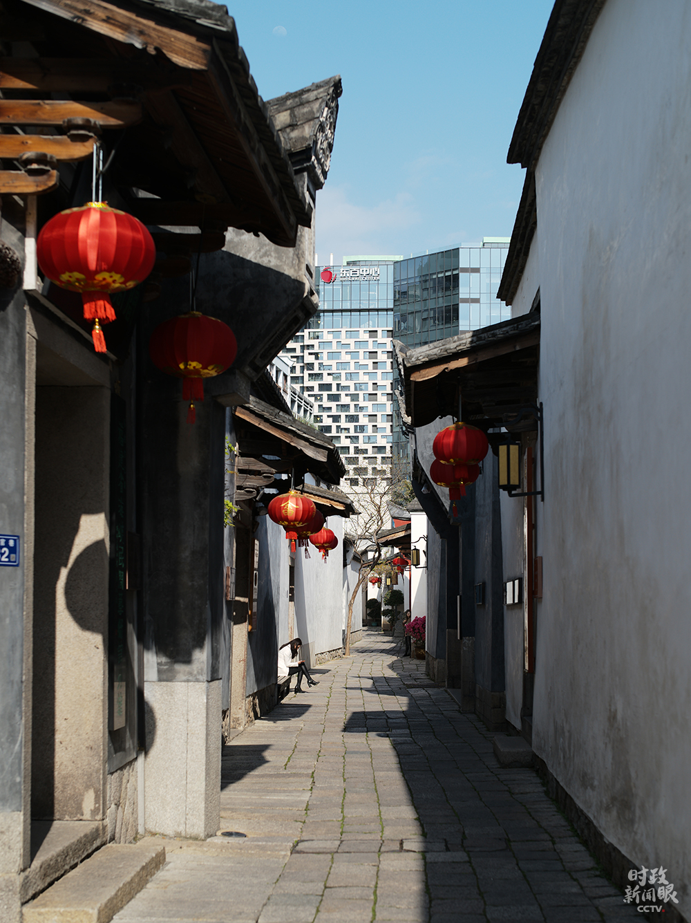 △走進郎官巷,可以看到街區(qū)外的高樓,新舊建筑風格交相輝映。(總臺央視記者彭漢明拍攝)
