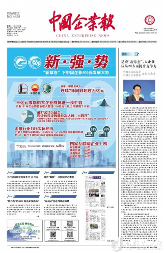 《中國企業(yè)報》是由中國企業(yè)聯(lián)合會、中國企業(yè)家協(xié)會主管主辦,是中國唯一以企業(yè)和企業(yè)家為報道核心的中央級媒體。《中國企業(yè)報》是一張專為中國企業(yè)創(chuàng)辦的報紙。1988年1月4日,由國家經(jīng)委主辦,中國企業(yè)管理協(xié)會承辦的《中國企業(yè)報》正式創(chuàng)刊。陳云同志為報紙題寫了報頭,鄧力群任報社名譽(yù)顧問,袁寶華任報社名譽(yù)社長。從1988年創(chuàng)辦至今,秉承“面向企業(yè),為企業(yè)服務(wù)”的辦報宗旨,親歷和記錄著中國企業(yè)的改革進(jìn)程,同時伴隨著中國企業(yè)的發(fā)展壯大而不斷成長。經(jīng)過20多年的實踐探索,在報道企業(yè)新聞、推動企業(yè)改革、維護(hù)企業(yè)權(quán)益、促進(jìn)企業(yè)發(fā)展等方面,逐步形成了自身的風(fēng)格和特色,專業(yè)性、權(quán)威性日益得到了企業(yè)界和新聞界的認(rèn)同。