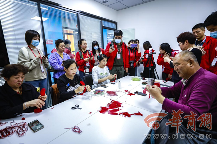 一折、一卷、六朵花瓣整齊羅列,細鐵絲緊緊繞圈固定,一朵火紅的手工花便成型了。“這個是我們的一些手工藝品,都是有延安特色的,如果你們想學的話,隨時來,我們這里免費培訓。”3月30日,在延安市寶塔區(qū)電商直播融合孵化服務中心的直播間里,60歲的退休工人董智玲正在直播間里給網友直播手工藝品制作,引來了眾多記者的圍觀。