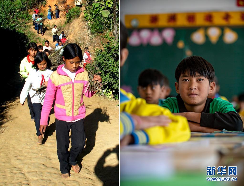 這張拼版照片的左圖:2003年12月6日,云南省瀾滄拉祜族自治縣富邦鄉(xiāng)半山村小學(xué)的學(xué)生李娜兒(前)在拾柴(新華社記者 李銀 攝);右圖:2021年3月2日,李娜兒的兒子在富邦鄉(xiāng)中心完小五年級(jí)的課堂上(新華社記者 江文耀 攝)。新華社發(fā)
