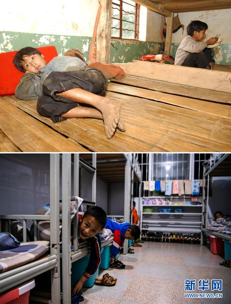 這張拼版照片的上圖:2003年6月13日,云南省瀾滄拉祜族自治縣木戛鄉(xiāng)哈卜嗎村小學(xué)的孩子在宿舍休息(新華社記者 秦晴 攝);下圖:2021年3月3日,云南省瀾滄拉祜族自治縣木戛鄉(xiāng)哈卜嗎村小學(xué)的孩子們準(zhǔn)備睡覺(jué)(新華社記者 江文耀 攝)。新華社發(fā)