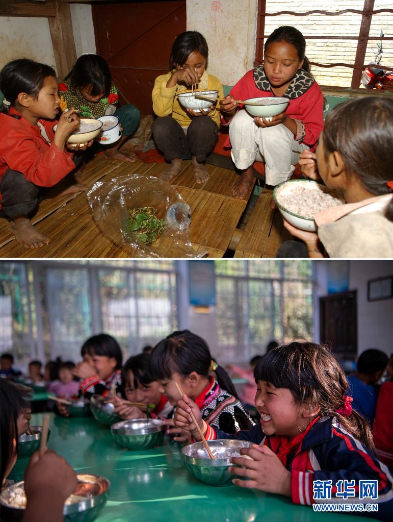 這張拼版照片的上圖:2003年12月6日,云南省瀾滄拉祜族自治縣富邦鄉(xiāng)半山村小學(xué)的孩子們?cè)诔燥垼ㄐ氯A社記者 李銀 攝);下圖:2021年3月2日,云南省瀾滄拉祜族自治縣富邦鄉(xiāng)半山村小學(xué)已撤并到富邦鄉(xiāng)中心完小,這是孩子們?cè)诔燥垼ㄐ氯A社記者 江文耀 攝)。新華社發(fā)