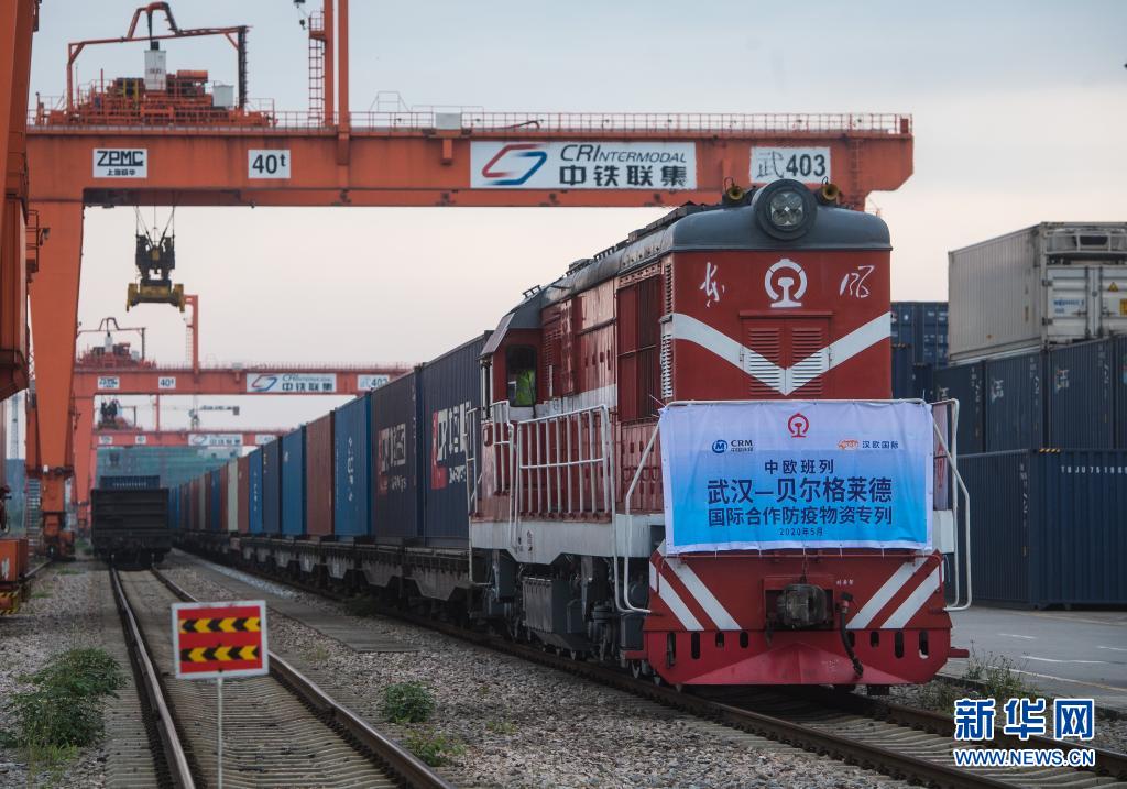 2020年5月9日,開往塞爾維亞貝爾格萊德的中歐班列(武漢)準(zhǔn)備從吳家山站駛出,該班列滿載3500立方米、294.42噸國際合作防疫物資,支援塞爾維亞及周邊國家抗擊新冠肺炎疫情。新華社記者 肖藝九 攝