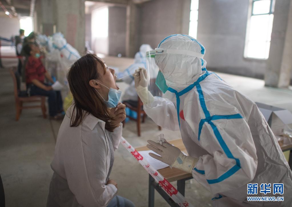 2020年5月15日,在武漢華生漢口城市廣場四期檢測點(diǎn),工作人員對市民進(jìn)行核酸檢測。新華社記者 肖藝九 攝