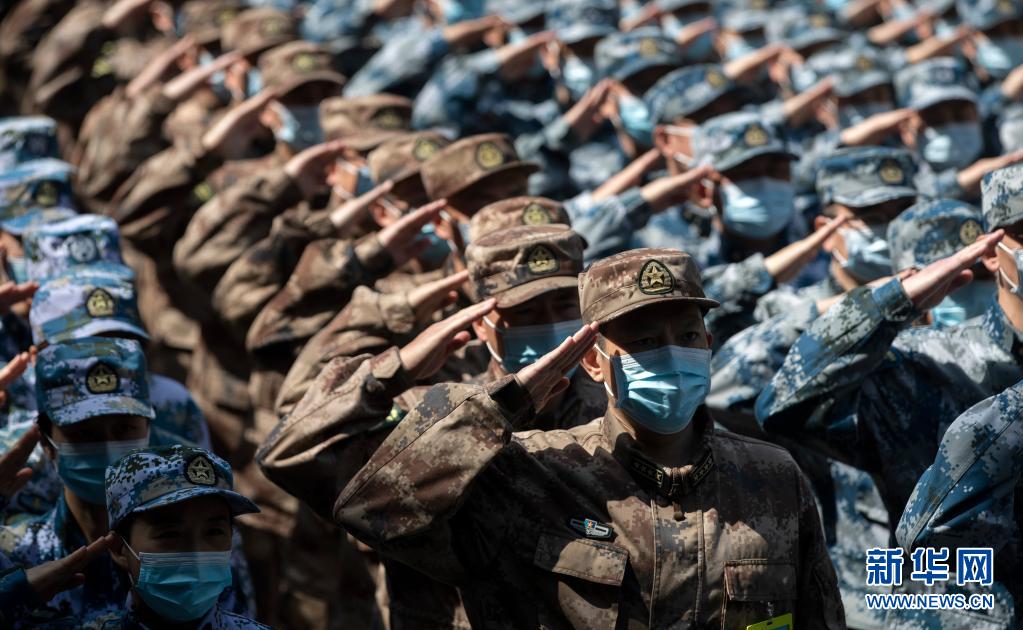 2020年4月15日,最后一批回撤的軍隊(duì)支援湖北醫(yī)療隊(duì)隊(duì)員向火神山醫(yī)院敬禮告別。新華社記者 費(fèi)茂華 攝