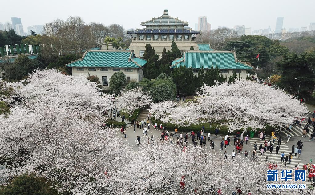 3月13日,武漢大學(xué)抗疫醫(yī)護(hù)人員賞櫻專場啟動,來自全國各地的援鄂抗疫英雄在櫻花樹下重逢,盡享櫻花之約(無人機(jī)照片)。新華社記者 程敏 攝