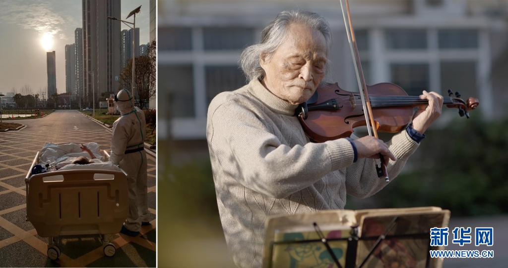 這是一張拼版照片,左圖為:2020年3月5日傍晚,在湖北省武漢大學(xué)人民醫(yī)院東院,復(fù)旦大學(xué)附屬中山醫(yī)院支援湖北醫(yī)療隊(duì)醫(yī)生在護(hù)送患者王欣做CT的途中停下,讓住院近一個月的老人欣賞久違的日落(甘俊超 攝);右圖為:3月24日,“看夕陽的老人”王欣在東西湖區(qū)園藝花城小區(qū)內(nèi)拉小提琴(新華社記者熊琦攝)。新華社發(fā)