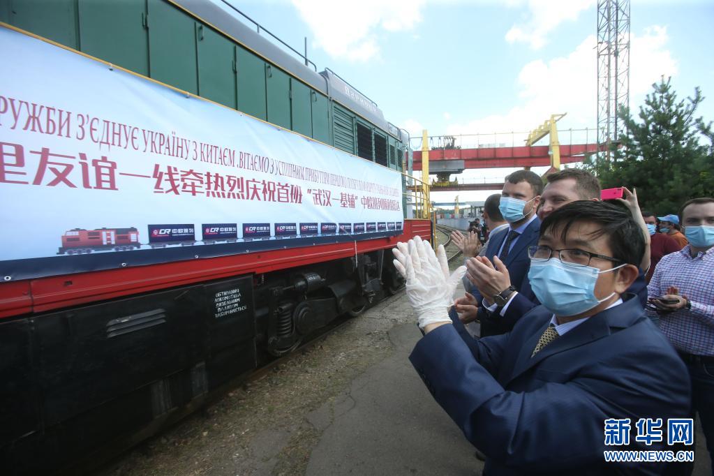 2020年7月6日,在烏克蘭首都基輔市利斯基貨運(yùn)站,中烏兩國代表迎接“武漢—基輔”中歐班列。該班列是中國華中地區(qū)首列直達(dá)烏克蘭的中歐班列。新華社發(fā)(謝爾蓋·斯塔拉斯堅(jiān)科攝)