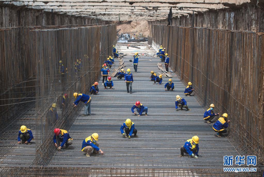 2020年4月30日,來自中鐵七局的建設(shè)者在武漢武九北綜合管廊工程施工現(xiàn)場作業(yè)。新華社記者 肖藝九 攝