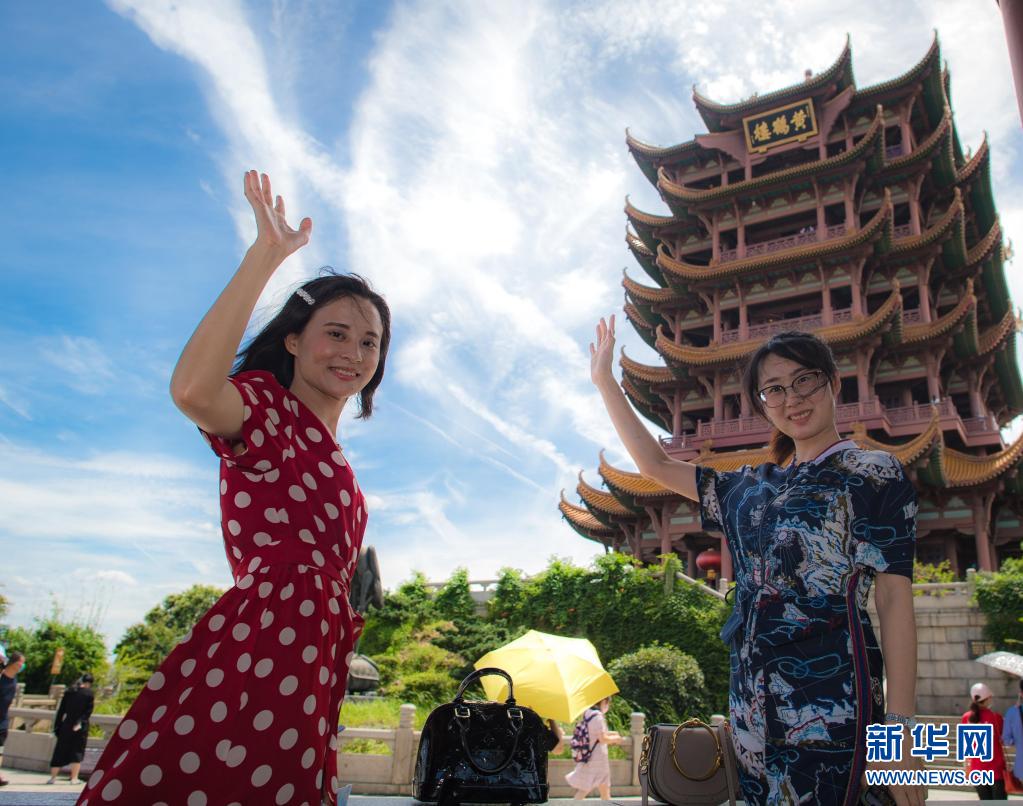 2020年8月7日,受邀來湖北旅游的海南援鄂醫(yī)療隊(duì)員陳小妹(左)與同事計(jì)超在黃鶴樓景區(qū)觀光。湖北省組織“與愛同行 惠游湖北”活動,陸續(xù)邀請?jiān)踽t(yī)護(hù)人員代表以及湖北醫(yī)護(hù)人員、社區(qū)工作者、志愿者等走進(jìn)景區(qū),飽覽荊楚風(fēng)貌。新華社記者 肖藝九 攝