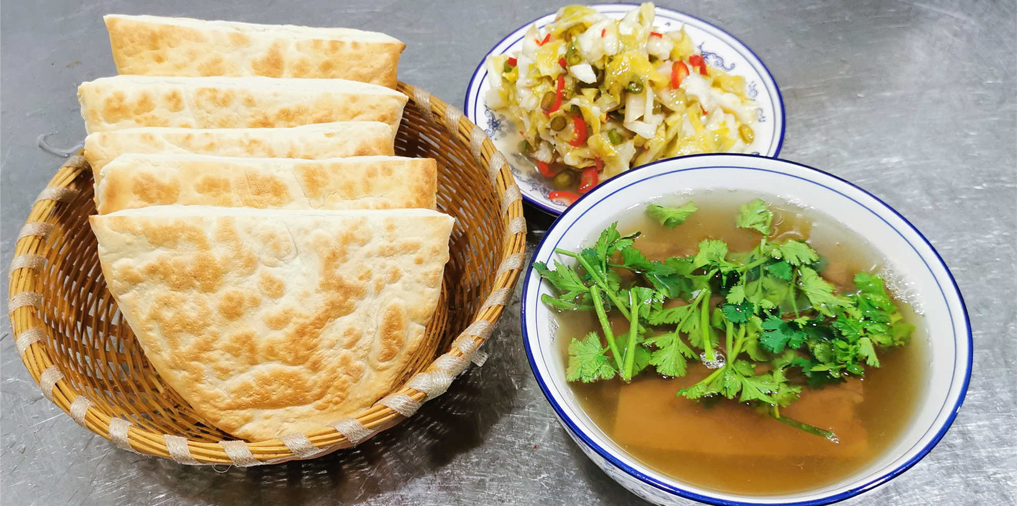 肉爛湯清,味美可口,配上“月牙餅”、大蒜和泡菜同吃,口味尤美。