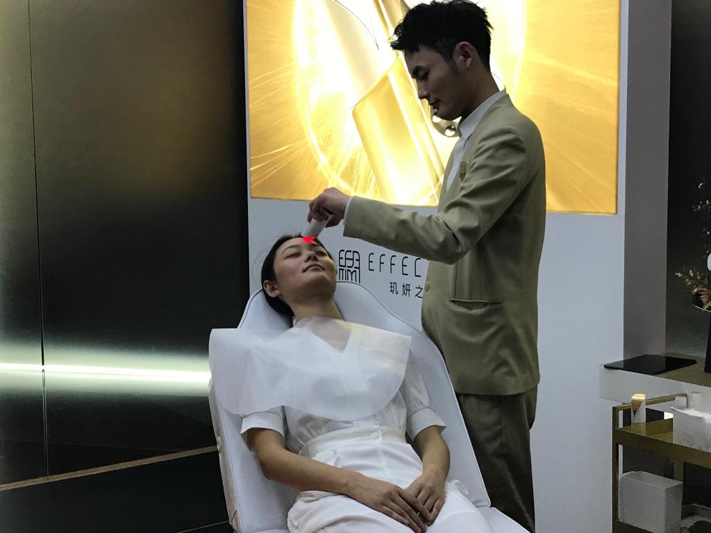 圖為消費(fèi)者體驗(yàn)“EFFECTIM璣妍之光”的首發(fā)新品。新華社記者 周蕊 攝