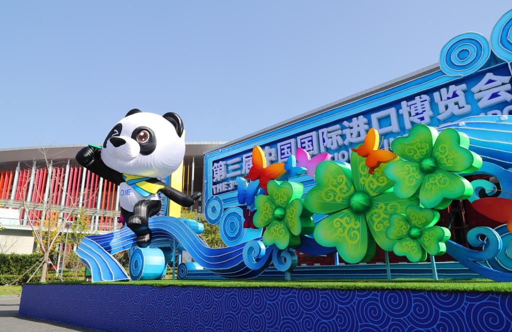 國(guó)家會(huì)展中心(上海)西入口處擺放的熊貓“進(jìn)寶”主題進(jìn)博會(huì)裝飾(2020年10月23日攝)。新華社記者 方喆 攝