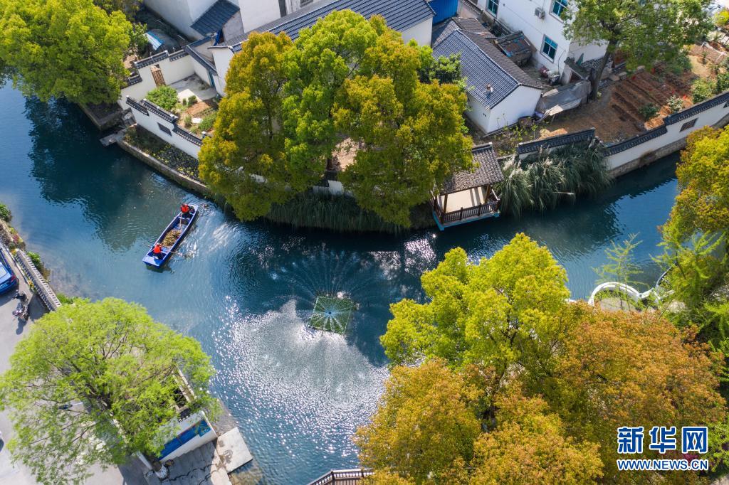 浙江省長興縣龍山街道渚山村,保潔人員進(jìn)行日常河道護(hù)理巡查(2020年4月9日攝,無人機(jī)照片)。新華社記者 徐昱 攝