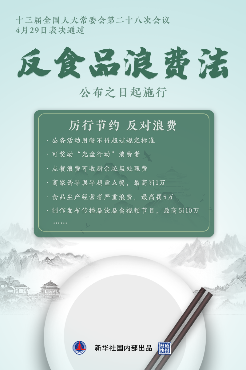 4月29日,十三屆全國人大常委會第二十八次會議表決通過反食品浪費法,防止食品浪費從此有法可依。