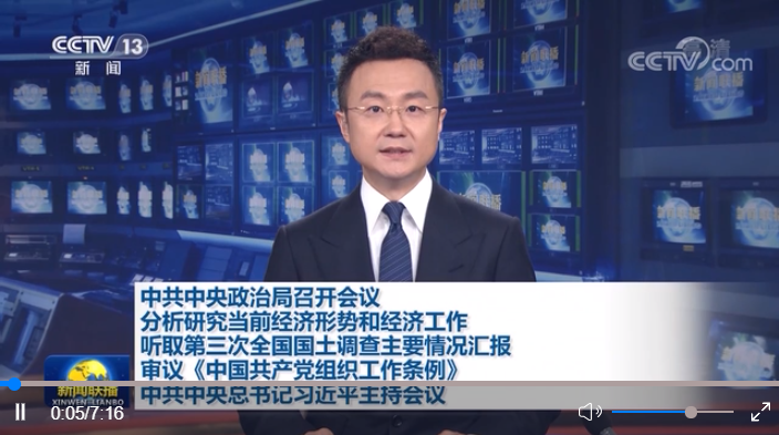分析研究當(dāng)前經(jīng)濟(jì)形勢(shì)和經(jīng)濟(jì)工作 聽取第三次全國(guó)國(guó)土調(diào)查主要情況匯報(bào) 審議《中國(guó)共產(chǎn)黨組織工作條例》