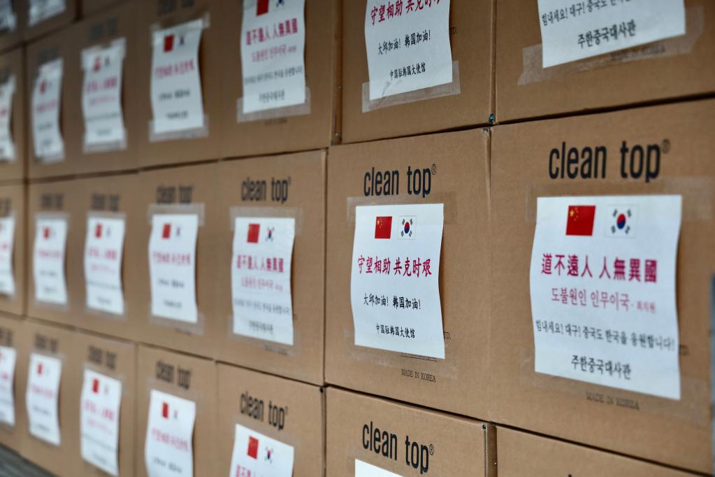 2020年2月27日,在韓國(guó)首爾,中國(guó)駐韓國(guó)大使館緊急籌備的醫(yī)用口罩準(zhǔn)備運(yùn)往大邱。箱子外包裝上寫(xiě)著:“道不遠(yuǎn)人 人無(wú)異國(guó)”“守望相助 共克時(shí)艱”等支持的話語(yǔ)。