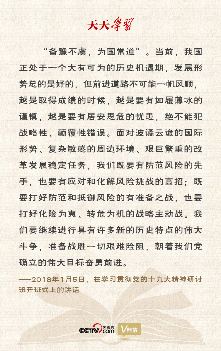 今天,我們比歷史上任何時期都更接近、更有信心和能力實現(xiàn)中華民族偉大復(fù)興的目標。但前進道路上,還有許多“雪山”“草地”需要跨越,還有許多“婁山關(guān)”“臘子口”需要征服。我們既要有防范風(fēng)險的先手,也要有應(yīng)對和化解風(fēng)險挑戰(zhàn)的高招;既要打好防范和抵御風(fēng)險的有準備之戰(zhàn),也要打好化險為夷、轉(zhuǎn)危為機的戰(zhàn)略主動戰(zhàn)。居安思危、銳意進取,努力續(xù)寫百年大黨不斷走向勝利的時代新篇。