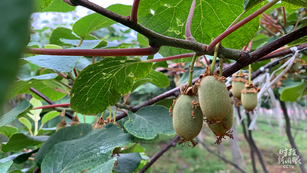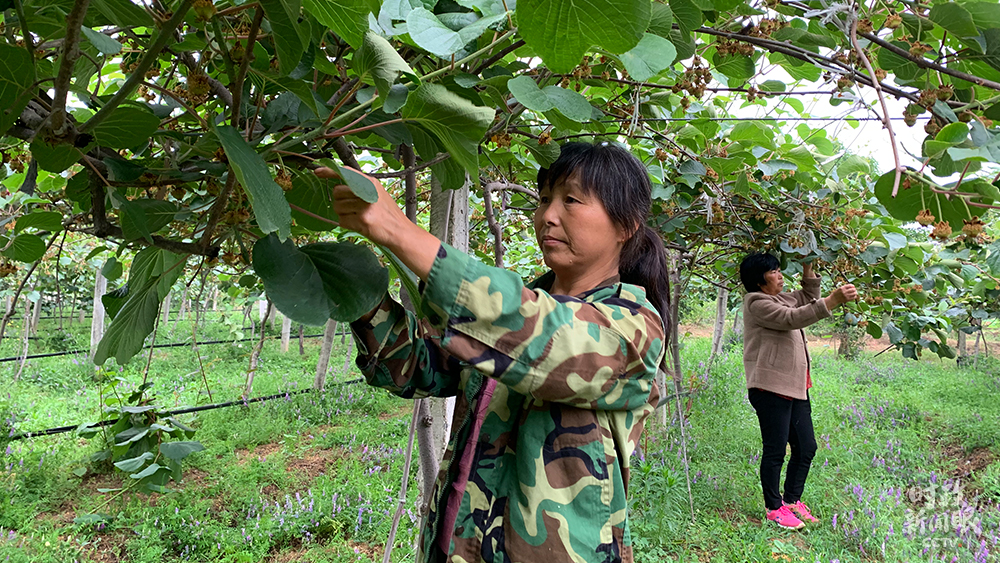△村民正在為獼猴桃疏果。(總臺(tái)央視記者段德文、盧心雨拍攝)