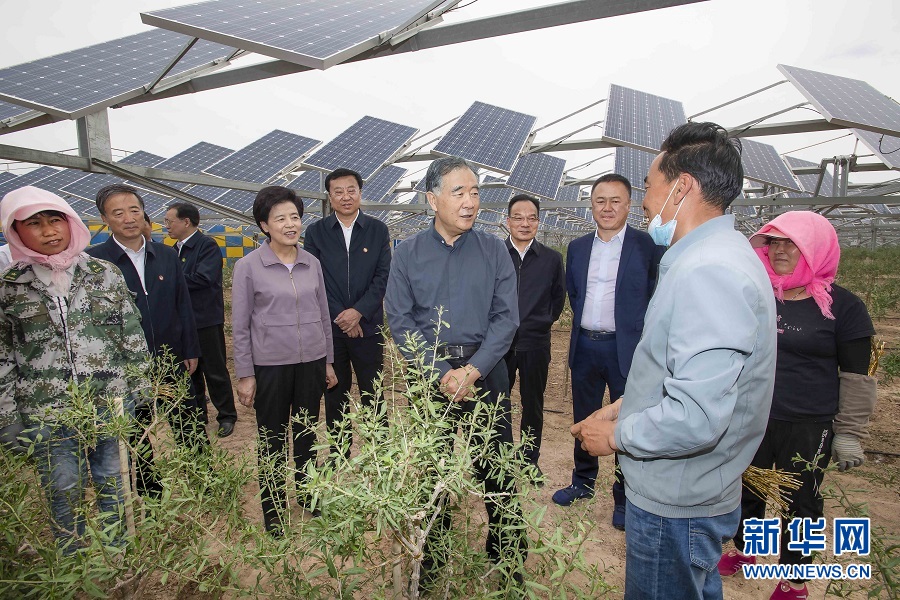 5月17日至19日,中共中央政治局常委、全國(guó)政協(xié)主席汪洋在寧夏調(diào)研。這是18日,汪洋在寶豐農(nóng)光一體化項(xiàng)目基地同工作人員親切交談。新華社記者 李濤 攝