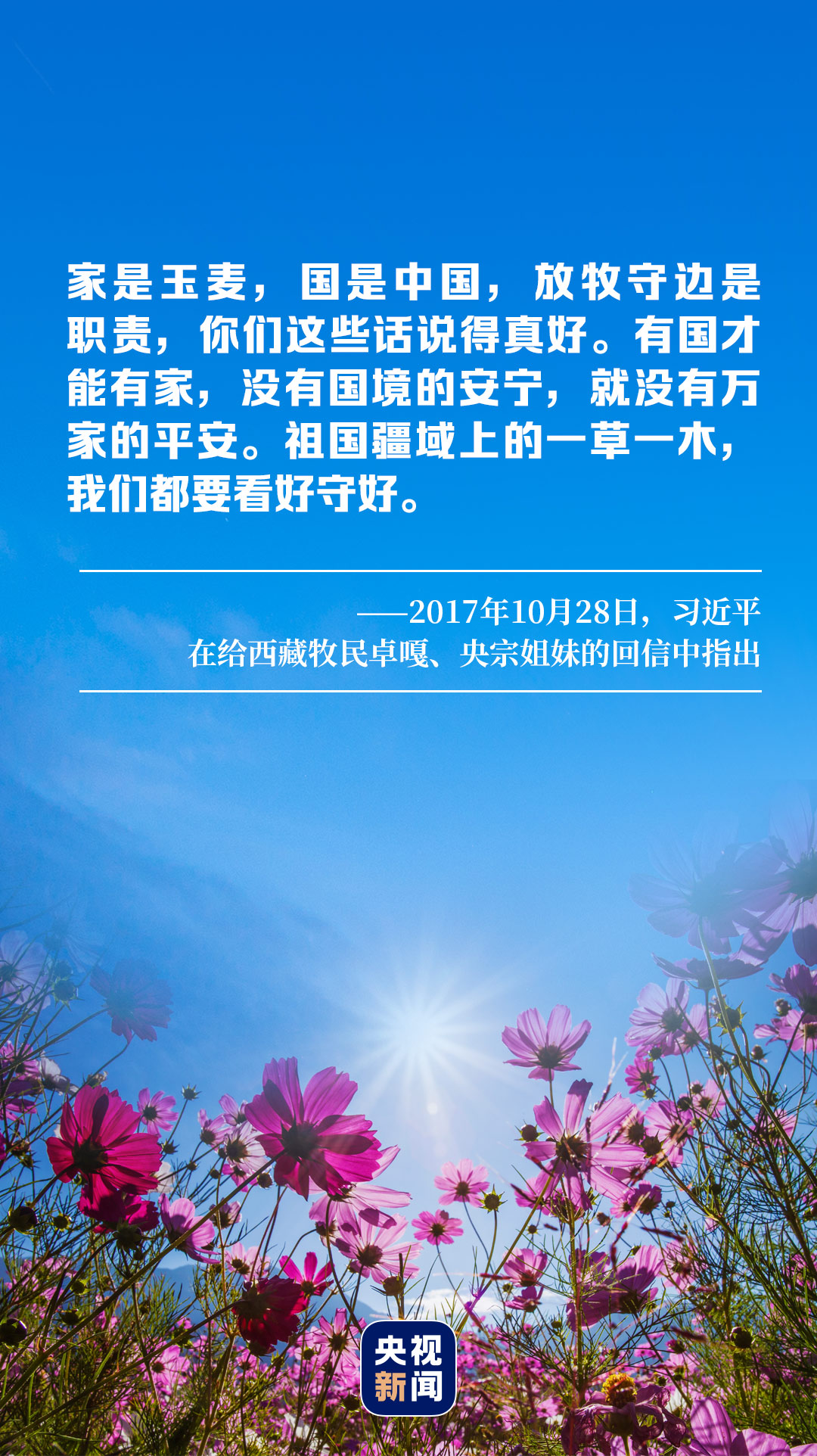 2017年10月,習(xí)近平給卓嘎、央宗姐妹回信,稱贊兩姐妹“家是玉麥,國是中國”的境界,強調(diào)“有國才能有家,沒有國境的安寧,就沒有萬家的平安”。