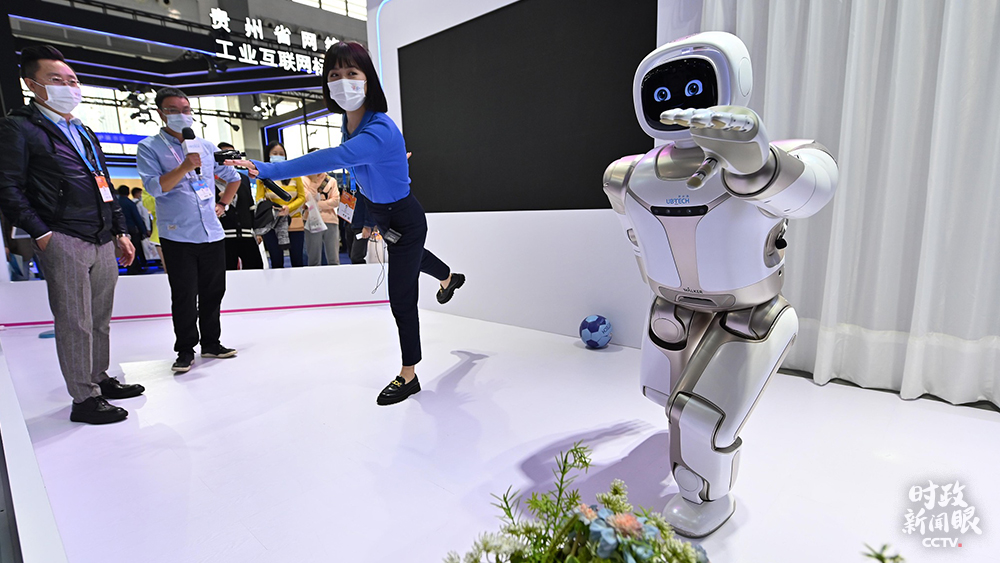 △2021年5月,貴陽(yáng),參會(huì)者在數(shù)博會(huì)上觀看一款能澆花、遞送飲料、踢球的智能機(jī)器人。(圖/視覺(jué)中國(guó))