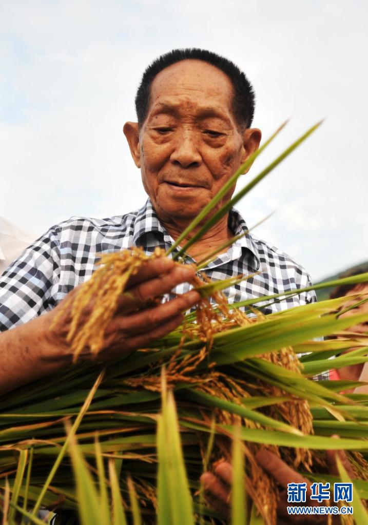 2013年8月19日,袁隆平院士在廣西桂林市灌陽縣黃關(guān)鎮(zhèn)聯(lián)德村袁隆平超級(jí)稻第四期攻關(guān)示范片查看水稻生長(zhǎng)情況。新華社記者 陸波岸 攝