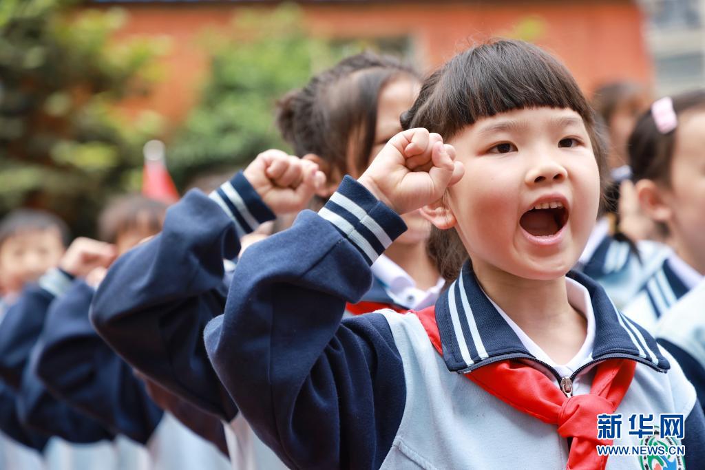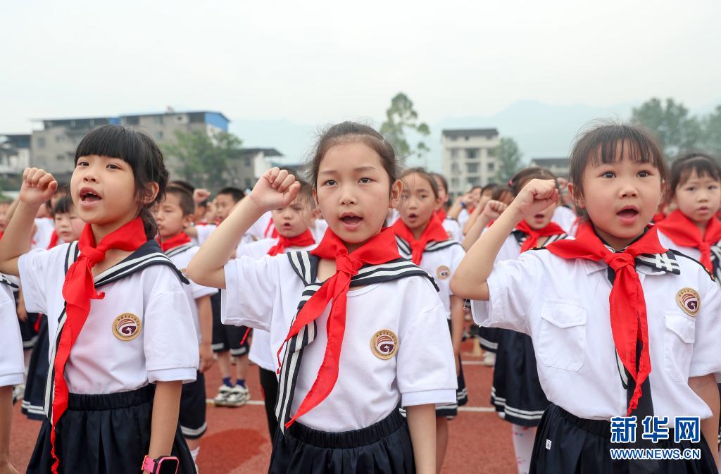 5月31日,四川省華鎣市高興鎮(zhèn)小學(xué)少先隊新隊員在入隊儀式上宣誓。新華社發(fā)(邱海鷹 攝)