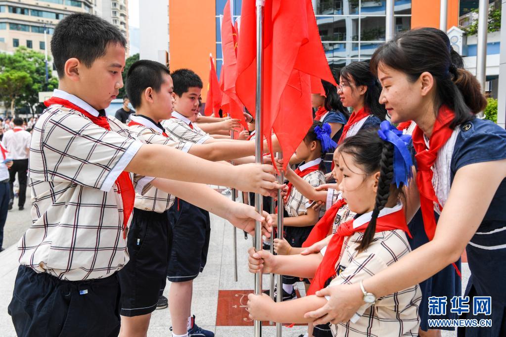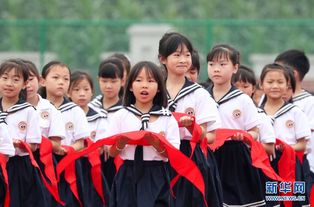 5月31日,南寧市濱湖路小學(xué)的學(xué)生參加入隊儀式。新華社記者 曹祎銘 攝