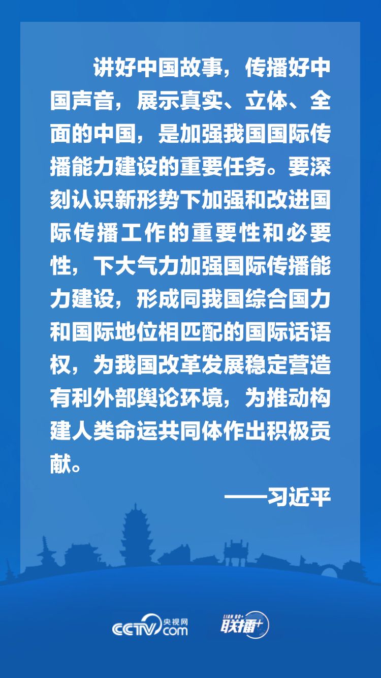 黨的十八大以來(lái),我國(guó)大力推動(dòng)國(guó)際傳播守正創(chuàng)新,理順內(nèi)宣外宣體制,打造具有國(guó)際影響力的媒體集群,積極推動(dòng)中華文化走出去,有效開展國(guó)際輿論引導(dǎo)和輿論斗爭(zhēng),初步構(gòu)建起多主體、立體式的大外宣格局,國(guó)際話語(yǔ)權(quán)和影響力顯著提升。面對(duì)新的形勢(shì)和任務(wù),應(yīng)如何加強(qiáng)我國(guó)國(guó)際傳播能力建設(shè)?央視網(wǎng)《聯(lián)播+》特梳理總書記講話要點(diǎn),與您一起學(xué)習(xí)領(lǐng)悟。