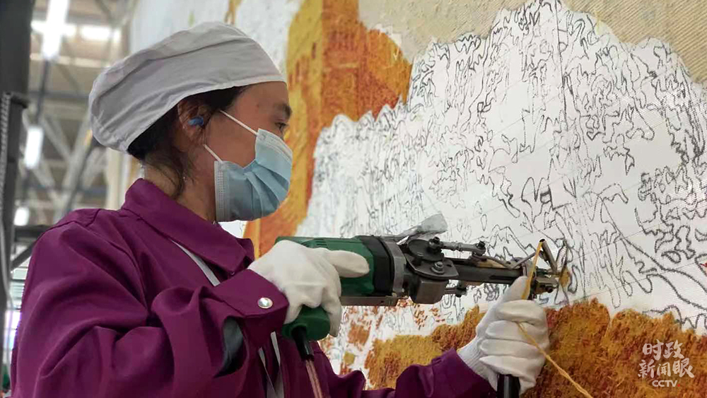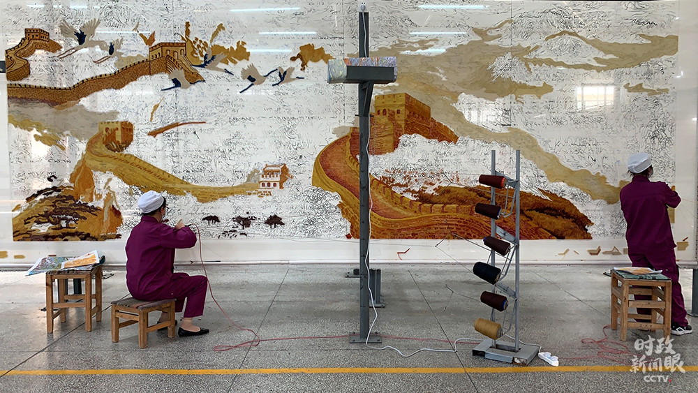 △這幅手工槍刺藏毯以長城為原型,面積接近14平方米。兩人同時(shí)操作需兩個(gè)月時(shí)間完成。(總臺(tái)央視記者王鵬飛、楊松濤拍攝)