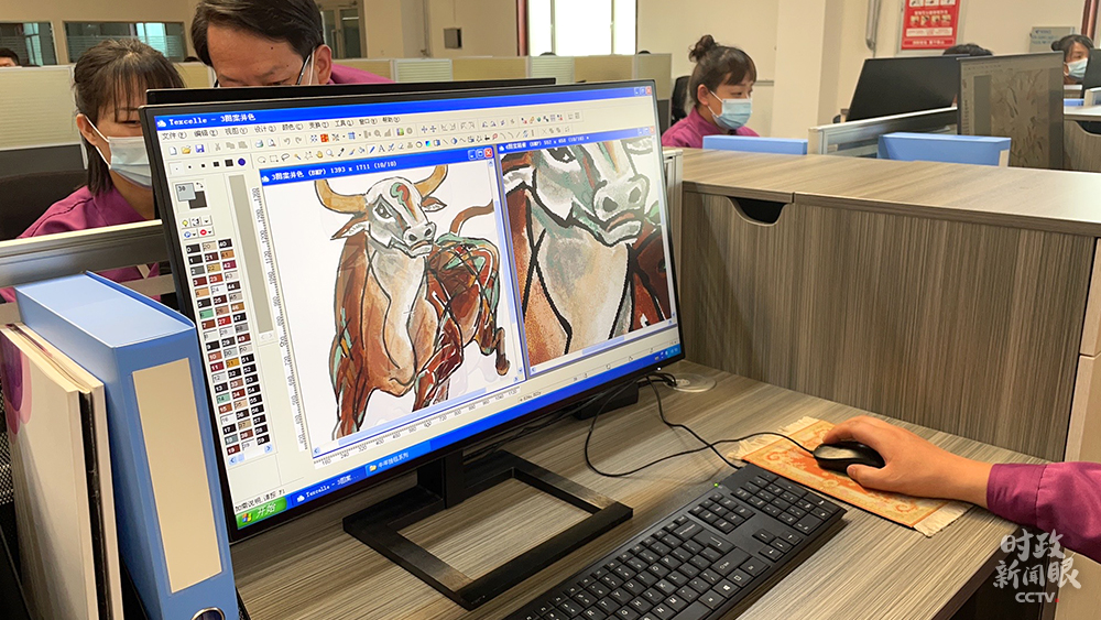 △設(shè)計(jì)研發(fā)部正在修改名為“奮發(fā)圖強(qiáng)”的藏毯圖樣。(總臺(tái)央視記者楊松濤、楊立峰拍攝)