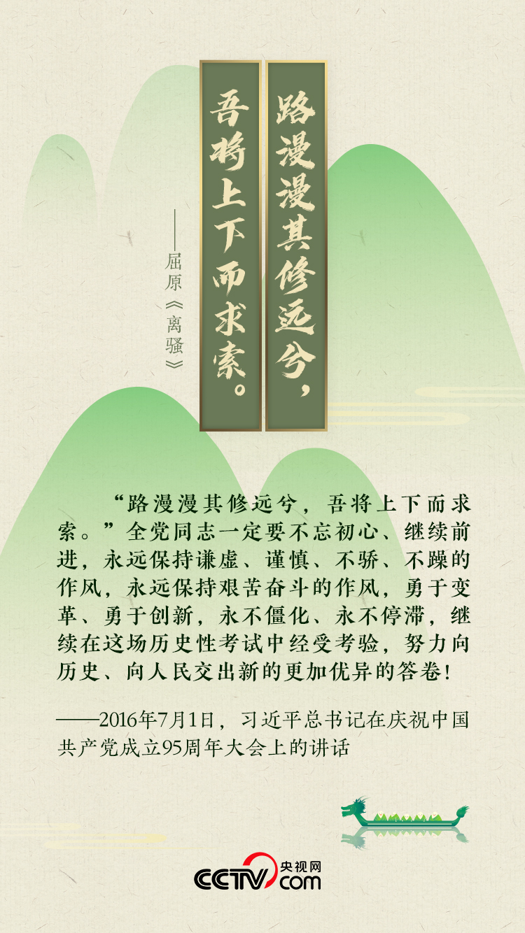 2016年7月,在慶祝中國共產(chǎn)黨成立95周年大會上,習近平總書記娓娓道出屈原的名句“路漫漫其修遠兮,吾將上下而求索”,號召全黨同志不忘初心,勇于變革創(chuàng)新,繼續(xù)前進。