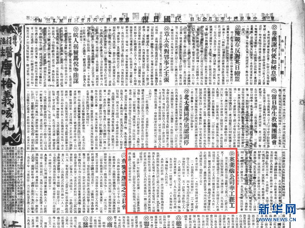 1921年7月27日的《民國日報》上登載了上海浦東英美煙草公司華工罷工的消息。新華社發(fā)(上海圖書館提供)