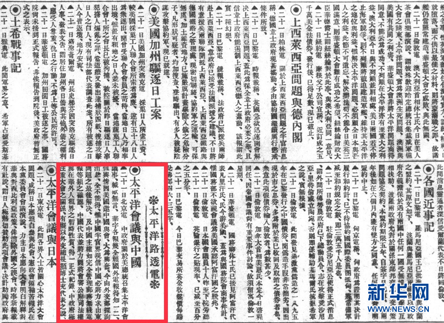 1921年7月23日《申報》上的消息《太平洋會議與中國》。新華社發(fā)(上海圖書館提供)