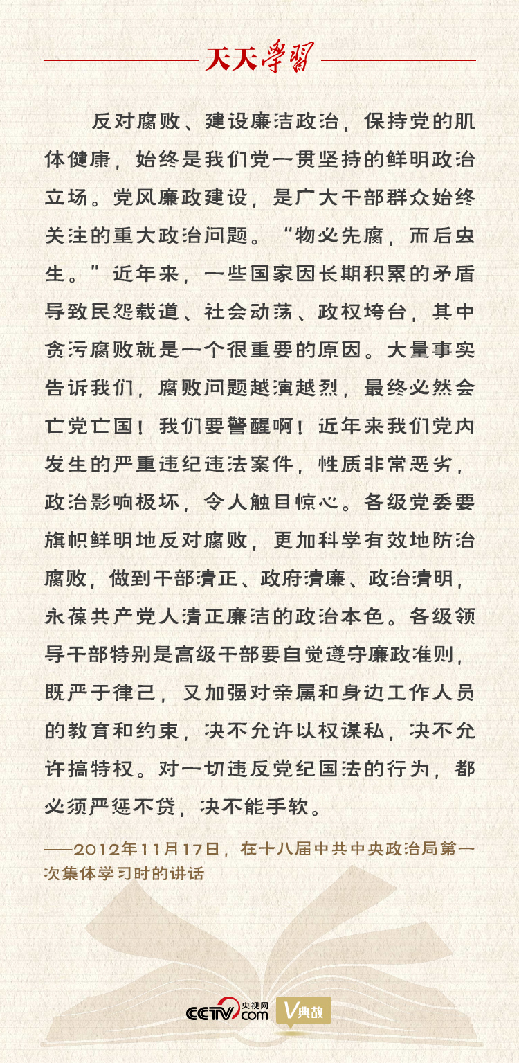黨風(fēng)廉政建設(shè)永遠(yuǎn)在路上,反腐敗斗爭(zhēng)永遠(yuǎn)在路上。當(dāng)前,反腐敗斗爭(zhēng)雖然取得了壓倒性勝利并不斷鞏固發(fā)展,但形勢(shì)依然嚴(yán)峻復(fù)雜。腐敗問(wèn)題具有頑固性、反復(fù)性、長(zhǎng)期性,我們必須堅(jiān)持把反腐敗斗爭(zhēng)擺在極為重要的位置,才能經(jīng)受住“四大考驗(yàn)”、克服“四種危險(xiǎn)”。只要堅(jiān)持管黨治黨不放松、正風(fēng)肅紀(jì)不停步、反腐懲惡不手軟,我們就一定能夠跳出治亂興衰的歷史周期率,贏得這場(chǎng)輸不起也決不能輸?shù)恼味窢?zhēng),引領(lǐng)和保障中國(guó)特色社會(huì)主義巨輪行穩(wěn)致遠(yuǎn)!
