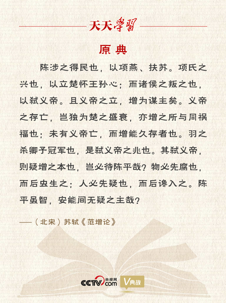 《范增論》是蘇軾早期的一篇史論文章,收錄在《古文觀(guān)止》卷十。文中蘇軾針對(duì)陳平用計(jì)離間項(xiàng)羽和范增的觀(guān)點(diǎn),翻空出奇,立意新穎地提出:“物必先腐也,而后蟲(chóng)生之;人必先疑也,而后讒入之。”作者打了個(gè)比方,東西總是自身先腐爛,然后蟲(chóng)子才會(huì)寄生,說(shuō)明事物總是自己先有弱點(diǎn)然后才為外物所侵。指出正是由于項(xiàng)羽生性多疑,聽(tīng)信讒言,才被敵人利用,從而招致慘敗。