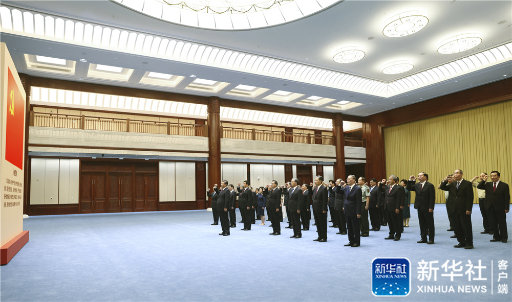 6月18日,黨和國家領(lǐng)導(dǎo)人習(xí)近平、李克強(qiáng)、栗戰(zhàn)書、汪洋、王滬寧、趙樂際、韓正、王岐山等在中國共產(chǎn)黨歷史展覽館參觀“‘不忘初心、牢記使命’中國共產(chǎn)黨歷史展覽”。這是參觀結(jié)束后,習(xí)近平帶領(lǐng)黨員領(lǐng)導(dǎo)同志一起重溫入黨誓詞。新華社記者 李學(xué)仁 攝