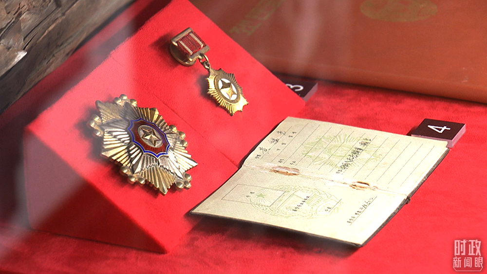 △黃繼光獲授的朝鮮民主主義人民共和國(guó)一級(jí)國(guó)旗勛章、金星獎(jiǎng)?wù)?。(總臺(tái)央視記者李曉周拍攝)