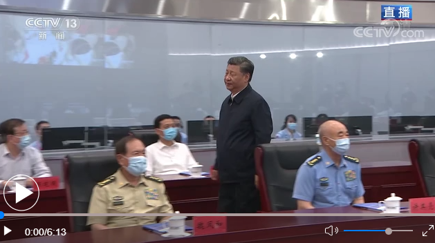 9時40分,習(xí)近平起身,走到前方指揮席。聶海勝、劉伯明、湯洪波3名航天員精神飽滿,向習(xí)近平敬禮。