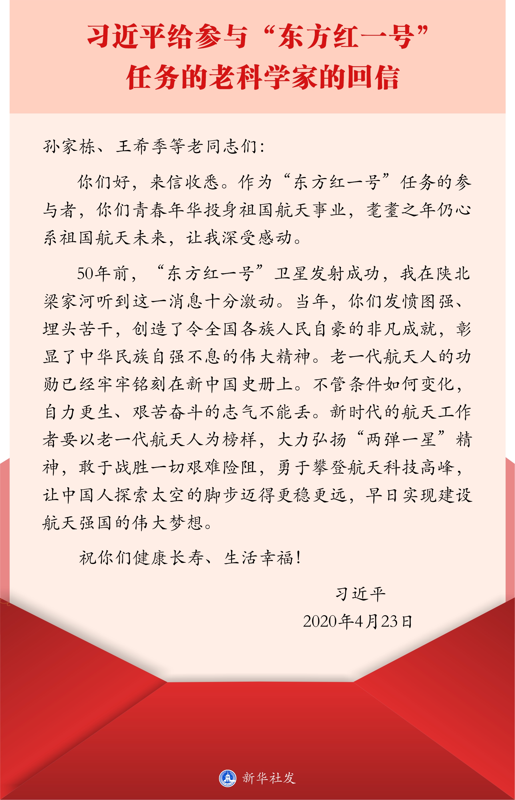 ↑2020年4月23日,習(xí)近平給參與“東方紅一號(hào)”任務(wù)的老科學(xué)家回信。