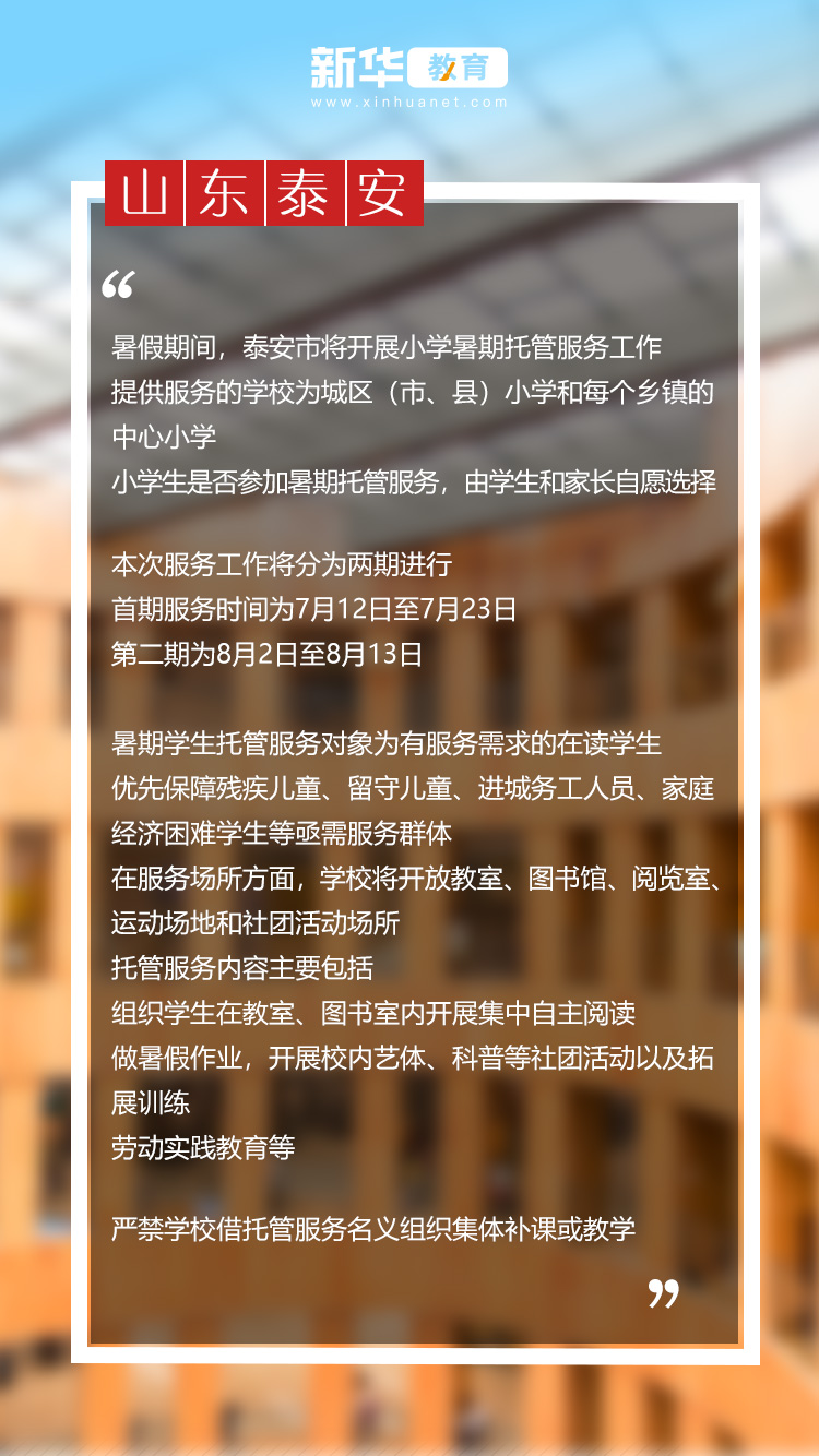 和上海市的做法類似,北京、武漢等地,也發(fā)揮資源優(yōu)勢(shì),積極志愿為學(xué)生提供暑期托管服務(wù)。與此同時(shí),北京明確要求“不組織學(xué)科培訓(xùn)和集體授課”;上海明確暑托班堅(jiān)持“公益、自愿”原則;山東泰安也提出“對(duì)家庭條件困難的學(xué)生,將免收服務(wù)費(fèi)用”,這些做法在給予家長(zhǎng)更多選擇的同時(shí),也進(jìn)一步為家長(zhǎng)減輕了育兒成本。