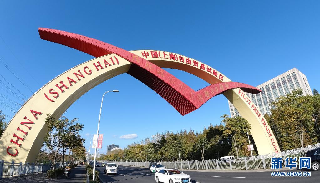 位于上海浦東新區(qū)楊高北路上的中國(guó)(上海)自由貿(mào)易試驗(yàn)區(qū)標(biāo)志門(mén)(2020年11月11日攝)。新華社記者 方喆 攝