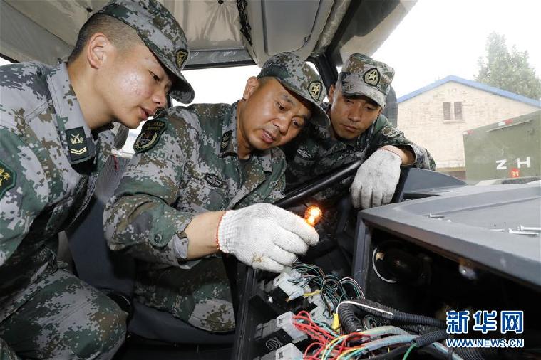 聯(lián)勤保障部隊某團(tuán)修理技師張俊凱(中)向戰(zhàn)友傳授修理方法(2019年5月30日攝)。 新華社發(fā)(曾曾 攝)