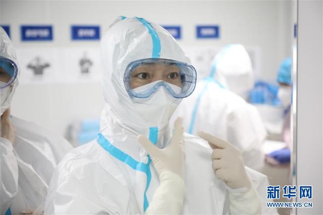 海軍軍醫(yī)大學(xué)第二附屬醫(yī)院急診、重癥醫(yī)學(xué)科護(hù)士長陳靜在武漢火神山醫(yī)院進(jìn)入“紅區(qū)”前檢查防護(hù)服(3月25日攝)。新華社發(fā)(陳晨 攝)