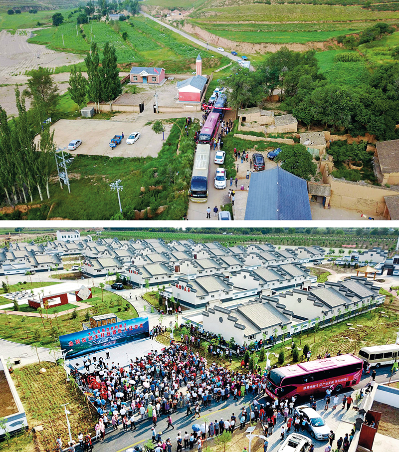上圖為寧夏西吉縣白崖鄉(xiāng)半子溝村村民準備集體搬遷至寧夏銀川市金鳳區(qū)潤豐村。下圖為銀川市金鳳區(qū)潤豐村迎來首批138戶移民入住,來自半子溝村的群眾統(tǒng)一乘坐大巴搬出大山,來移民新村開始新生活(2017年8月17日攝) 王鵬攝/本刊